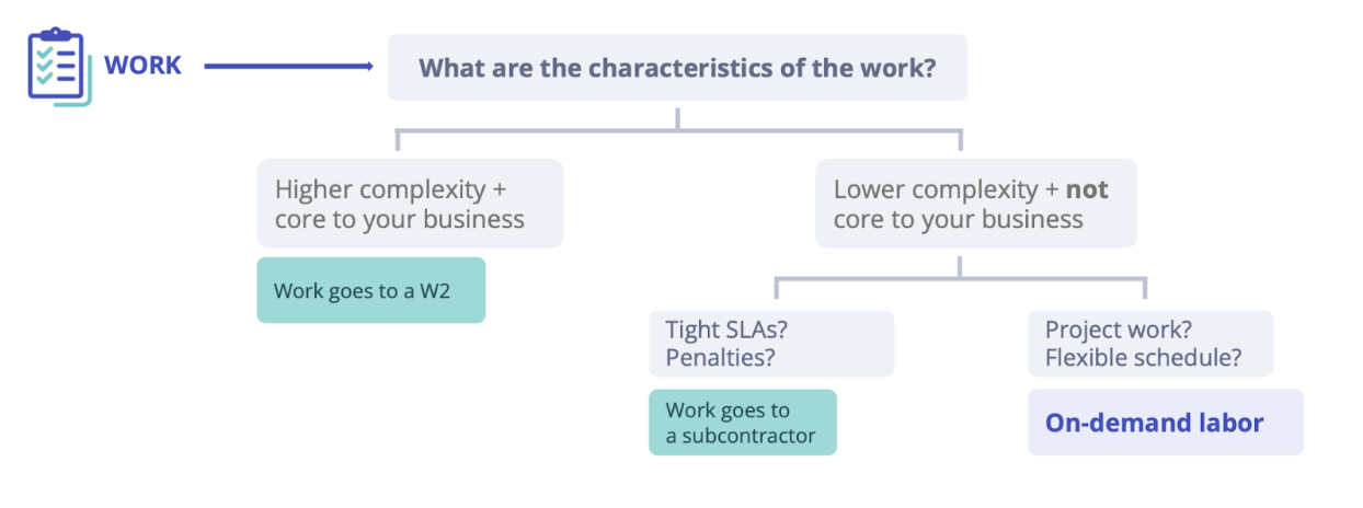 If you let the work determine the workforce as the work comes into the organization, this model of allocating work will assign jobs to the most appropriate labor group based on the specific tasks involved. This ensures the work will be completed at the required quality level and with the most important economic metrics in mind.