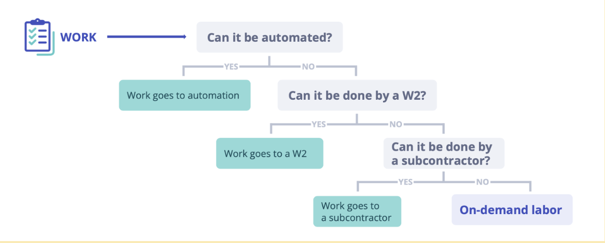 What we’re proposing is that a new organization “taskifies” the work. This approach breaks work down into its discrete components and assigns it to the most appropriate group: automation, full-time employees, subcontractors, or platform labor.