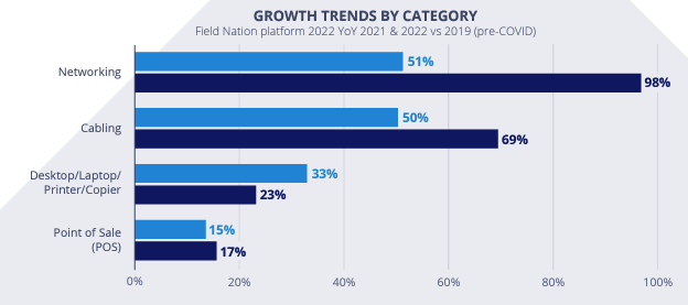 Connecting this novel retail technology and maximizing its efficacy translates into major cabling and networking infrastructure investments. This is apparent in YoY infrastructure growth patterns: The levels of YoY growth in networking and cabling post-COVID far exceed pre-COVID growth levels. Notably, work outside of this CX digitization trend (traditional POS, Desktop/Laptop) is not seeing the same acceleration of growth.