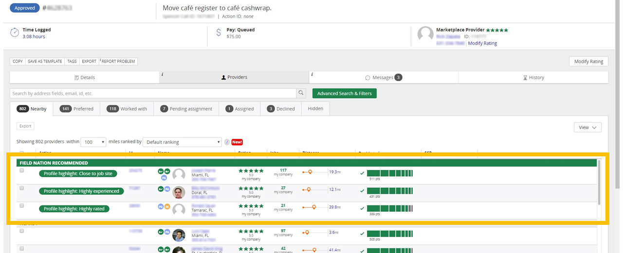 The default ranking rule in the Field Nation platform assigns point values for behavioral and historical data to bring the highest ranking providers to the top of your list. The greater the point value, the better they fit our ranking criteria. You can also create your own ranking rules with our platform tools under the red “NEW!” next to the selection rule dropdown.