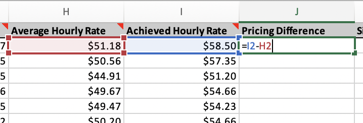 Open both the project-specific and original bid Excel files and verify that they’re both sorted by Postal Code. Then, select the entire Average Hourly Rate column from the project-based export and insert it next to the Average Hourly Rate column in the bid file. You can then insert a second column after these two where you’ll enter a calculation subtracting one column from the next.
