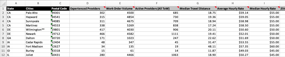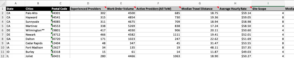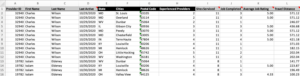 For each site, you’ll get detailed information about each provider that has completed relevant work within 60 miles of that site. You’ll get Provider ID and name to let you identify them on Field Nation, but you’ll also get a number of data points you can use to do some preliminary vetting. You can see how many jobs they completed, their average job rating, and the distance traveled. Each of these metrics is specific to the work completed within 60 miles of each individual site.