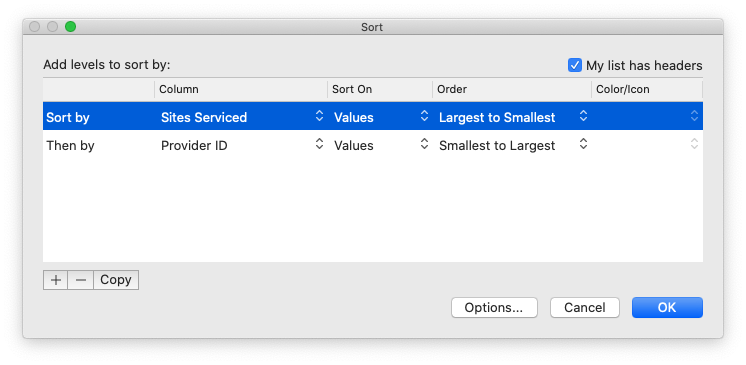 With this sort applied, you’ll be able to quickly see the sites where your talent pool doesn’t have great coverage. For purposes of this example, we’re showing an arbitrary cut-off of 5 or less experienced providers as the threshold for a problem site. Using that threshold, delete the sites with 6 or more experienced providers and save the results.