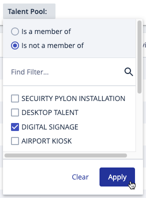 Using the same site list and set of filters from the first exercise, add an additional filter for Talent Pool, making sure to choose the “Is a member of” option.