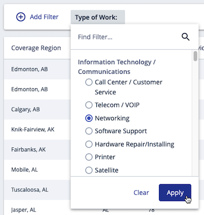 In this example, you can see that quite a few providers can potentially service more than one of your sites. One technician is completing work all over the midwest. Since he’s not currently in a talent pool, you probably want to reach out to him for further vetting.