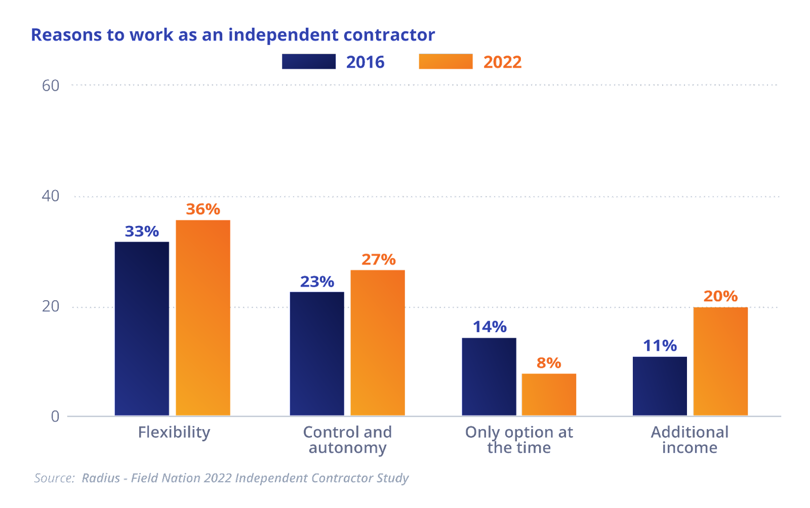 Professional field service independent contractors confirm the trend on labor platforms like Field Nation, which adds more than 600 qualified IT field service professionals nationwide each week. Also, the Radius – Field Nation 2022 Independent Contractor study of more than 800 IT field service professionals found 98% of respondents prefer independent contracting in some capacity, and 4 out of 5 IT field service independent contractors are satisfied with their work.