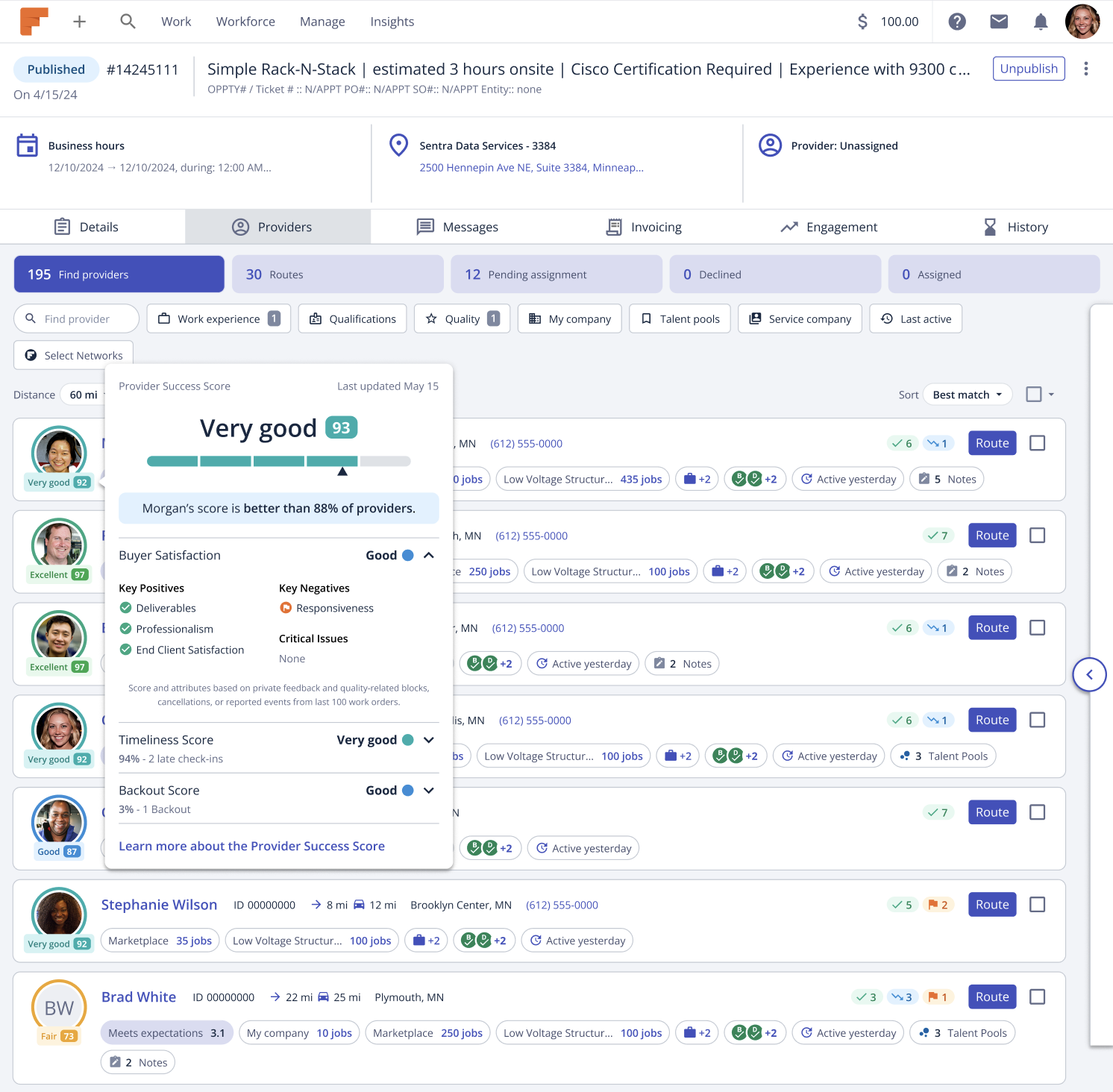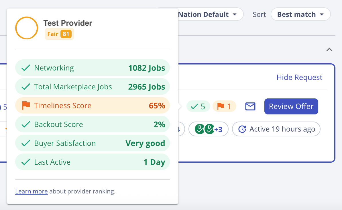 Buyers can now see the Provider Success Score (PSS) directly in Match. The Provider Success Score reflects three key components of excellent service delivery: timeliness, backouts, and buyer satisfaction.