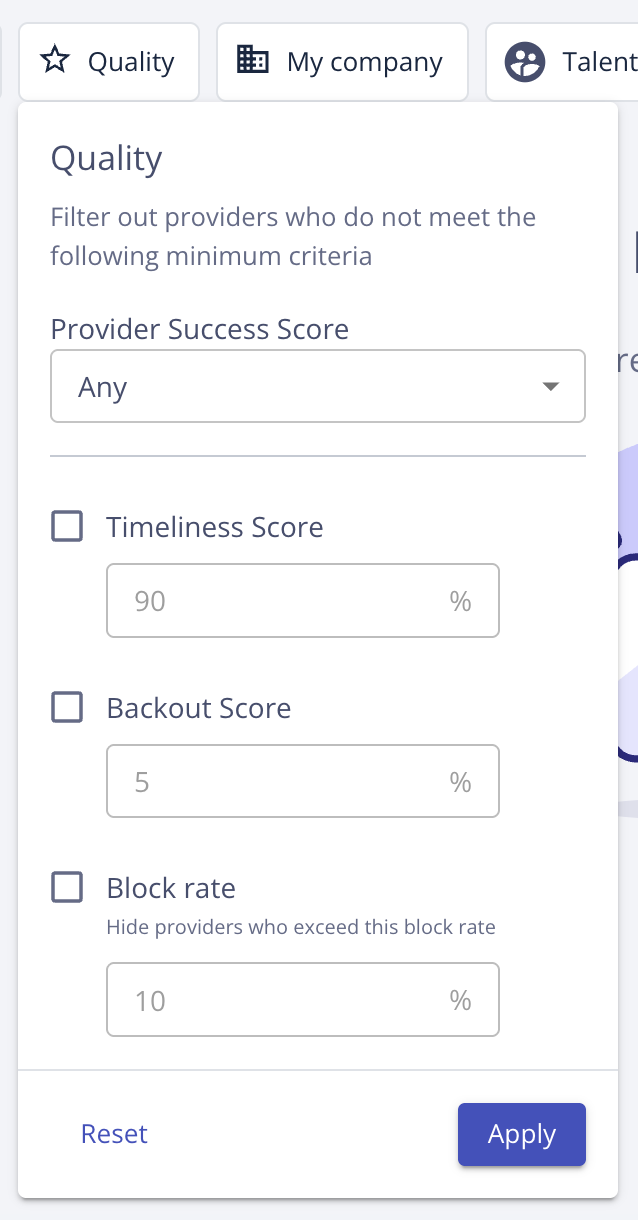 With this release, buyers can also filter by Provider Success Score, Timeliness Score, Backout Score, and Block Rate using the Quality filter within Provider Match.