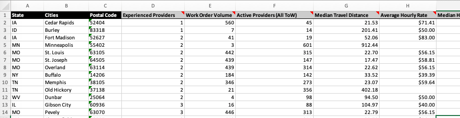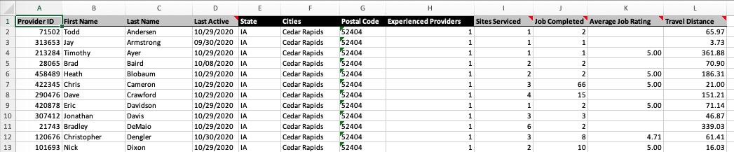 For each site, you’ll get detailed information about each provider that has completed relevant work within 60 miles of that site. You’ll get Provider ID and name to let you identify them on Field Nation, but you’ll also get a number of data points you can use to do some preliminary vetting. You can see how many jobs they completed, their average job rating, and the distance traveled. Each of these metrics is specific to the work completed within 60 miles of each individual site.